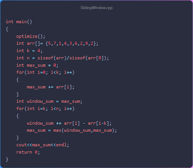 Sliding window is a problem solving technique by which we can find the maximum sum of k consecutive values in an n size array or array type data structure. This method usually uses a one-way for loop.